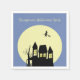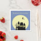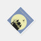 Espléndida silueta haunted de la casa con una bruja voladora a la luz de la luna en una espeluznante noche de Halloween. Un diseño divertido y caprichoso para cualquier producto. Antecedentes azules de medianoche y luna nueva amarilla nebulosa con la bruja amistosa volando sobre su palo de escoba lista para algunos trucos o dulces.