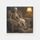 A skeleton sits in a plush armchair alongside a fluffy orange cat, both illuminated by the soft glow of a nearby lamp