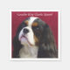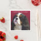 Esta es una servilleta de cóctel rojo con una fotografía original de un Cavalier de tres colores, el rey Charles Spaniel, con una expresión conmovedora, y el texto "Cavalier King Charles Spaniel"