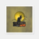 Una silueta del gato negro de Théophile Steinlen para el club Le Chat Noir en un entorno moderno con una luna amarilla brillante, una pared gris con hiedra y dos lámparas jack-o-lanterns.