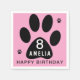 Niños Chicas rosados de Dog Paw Napkins Fiestas de cumpleaños. El diseño presenta un texto de cumpleaños Happy, un nombre en una huella de pata de perro negro en un fondo rosado. Personalice las servilletas con el nombre y la edad del niño.