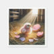 Una alegre chica rosa se sienta en un nido rodeado de cáscaras de huevo rotas con un patrón de gingham rosa dentro de un granero mientras la luz del sol entra por las latas de madera, iluminando la escena acogedora.