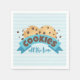 Las servilletas de rayas azules con un divertido diseño de galletas de chocolate, que incluye un par de galletas y un bocado de una de ellas, con chips de chocolate y migajas rociando por todas partes. Texto editable que dice "Cookies todo el tiempo" que también está sobre un diseño de cinta azul curvada.