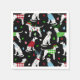 Cute Christmas dogs in festive holiday outfits. Dalmatian with black and white coats wear Santa hats, antlers, sweaters on a holiday background with scattered ornaments.