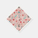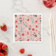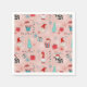 Paper napkins with whimsical holiday design featuring Santa cupcakes, snowmen, gift boxes, string lights, and snowflakes on a soft pink background.