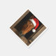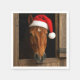 A horse wears a red Santa hat as it peeks out from a wooden stable, its warm tones beautifully contrasting with the festive colors