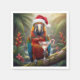 A colorful parrot wearing a Santa hat sits on a branch in a lush jungle, holding a cocktail with a candy cane garnish