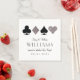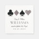 Las servilletas personalizados son el toque perfecto para su bar de cócteles Las Vegas o el casino, con un motivo clásico de trajes de cartas en purpurina plateado falso y negro y el nuevo apellido casado en texto prominente y de moda.