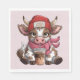 A cute cartoon cow sits sipping an iced coffee through a straw. She has brown and white spots, a pink scarf, and brown boots. On her head rests a red beanie with the words “Coffee Addict” written on it.