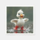 Un alegre pato blanco vestido con botas rojas de lluvia salpicado alegremente en un charco de lluvia
