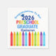 This adorable 2026 preschool graduation party napkin features a cool grad cap above colorful writing and a row of crayons in rainbow. Cute customizable pre-K graduate decor in fun colors for the last day of elementary school with your kid's name personalized in blue. Congratulations to our preschooler.