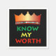 Las toallas con las palabras "Conoce mi valor" en colores africanos, con una corona dorada en la parte superior.