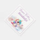 Estas mágicas y encantadoras toallas fiestas tienen un lindo unicornio bebé con pelo de arco iris y ojos grandes. El pequeño unicornio dulce está sentado en una nube purpurina azul y rosa, y varios corazones de Relieve metalizado rosado flotan a su lado.