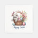 Las servilletas de papel de Pascua con un cordero blanco esponjoso sentado dentro de una cesta tejida, rodeado de coloridos huevos de Pascua. Los huevos están pintados en tonos vivos. Flores y hojas adornan el borde superior, creando una escena festiva y alegre.