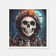 Piscinas de papel con un ilustracion de un esqueleto usando una chaqueta encapuchada con el gorra de una bruja naranja encima. Luna brillante en la parte de atrás con un solo bate volando cerca. Divertido diseño de Halloween del otoño.