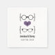 Quirky y moda Gafas Geeky Boda Papeles Napkins con un corazón morado flanqueado por dos pares de anteojos geky, una pareja masculina y una pareja de niñas que representan al novio y la novia. ¡Estas toallas, extravagantes pero sofisticadas, son perfectas para tu boda nerd! Fácil de personalizar, simplemente agregue los detalles de su gran día en los campos de texto proporcionados. Haga clic en el botón "Personalizar" para encontrar opciones de personalización adicionales.