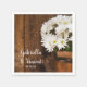 Añada un toque de encanto a la decoración de su fiesta de granero informal pero elegante ducha de novia o de la hora de cóctel de la recepción matrimonial con el pintoresco cubo de madera y las servilletas de papel de Boda de pasto de los White Daisies. Estas servilletas desechables de estilo rústico personalizado de moda estilo rancho occidental presentan una pintoresca fotografía floral de un cubo de madera lleno de flores de margarita blanca con un fondo de madera marrón.