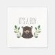 Diseño de bebés con temática de Woodland, por Shelby Allison, con un ilustracion de diseños florales y verdosos en torno a un retrato de un oso dulce con las palabras "es un niño".