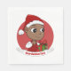 Las servilletas con el ilustracion de una linda sonriente niña o niño negro feliz, el bebé está usando ropas rojas y blancas y sosteniendo un regalo; con plantilla de texto editable para su nombre o mensaje, diseño de vacaciones para Navidades