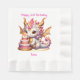 Un lindo dragón blanco, dorado y rosa chibi con servilletas de papel personalizadas para la fiesta de cumpleaños de un chica de tortas de cumpleaños. Fondo de báscula rosa y dorada.