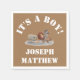 Personalizado El diseño temático de It's A Boy Cute Stuffed Animals presenta un fondo canela de la frase "¡Es un chico!" con letras blancas. También en las letras blancas está el nombre del bebé. El centro de diseño presenta una imagen de animales adorables y cariñosos todos apiñados listos para dar la bienvenida a un bebé.