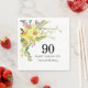 Toallas de papel floral muy bonitos amarillas para una fiesta de cumpleaños número 90. En la vegetación de Boho se esconden los aderezos y las flores moradas y blancas para crear un hermoso ramo primaveral. 90 está escrito en texto grande con el nombre del celebrante de cumpleaños debajo y luego un cumpleaños número cien. Todo el texto se puede personalizar. Así que puede cambiar la redacción, el color y el tipo de letra. Si necesitas un año diferente, esa es una opción fácil.