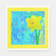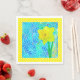 Esta servilleta de papel muestra un collage digital compuesto por varias capas de pinturas, texturas y escaneos. El soleado daffodil "sopla" de fondo azul. Los alegres puntos de polka amarillos y blancos forman un marco como toque final.