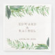 Sombras de verde acuarela para simples rociados de hojas. El follaje se proyecta con superposición blanca y los nombres y la fecha son personalizables. El color de la fuente es marrón granito.