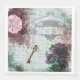 Flores de amapola rosadas y moradas, llave de esqueleto vintage y papel de periódico con pintura de color burdeos y marco ornamental vintage. Ideal para desvincular pequeños proyectos.