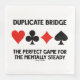 Muestra tu irónica actitud de doble puente con esta servilleta de papel que incluye los cuatro palos de cartas junto con el dicho "Duplicar el puente perfecto para el juego mentalmente estable". Puente memorable diciendo servilleta de papel para cualquier roca sólido jugador de puente duplicado para su próximo evento de tema del puente!