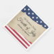 Estas servilletas fiestas personalizados presentan un tema patriótico del 4 de julio. El fondo es un diseño de papel pergamino de aspecto rústico y descolorido con un elegante tipo de letra de guión que se asemeja al documento de la Declaración de Independencia. La parte superior tiene un borde de estrellas blancas sobre un cartel azul marino, con rayas rojas y blancas colocadas a lo largo de la parte inferior para representar la bandera estadounidense. Son perfectas para una celebración íntima del 4 de julio, o para un gran fiesta.