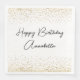 Estas servilletas de evento o fiesta presentan un tema clásico y elegante sobre un fondo blanco. El saludo "Feliz Cumpleaños" se imprime en una fuente de escritura negra a través del centro, seguido de un nombre de ejemplo en una fuente de escritura coincidente. Puede personalizar la placa para incluir su propio nombre personalizado u otro texto. El confeti purpurina de oro acentúa la parte superior e inferior de la servilleta.