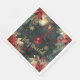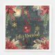 Navidades lujosos y festivos de diseño de servilletas vacacionales con un fondo nocturno de invierno verde oscuro con copos de nieve dorados brillantes, poinsettias pintadas con acuarela, conos de pino, bayas rojas con una linterna cálida y un brillante ornamento de bola roja con cinta roja cayendo al aire y Feliz Navidad escrito con escritura de brushkeada de oro. Joyeux Noel, Feliz Navidad y Felices Fiestas se añaden a esta servilleta. Personalizar y personalícelos mediante la herramienta Editar con diseño.