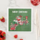Esta servilleta de papel tiene a Santa Claus montando un tren de Navidades rojos y blancos con ruedas de caramelos de menta con latas de caramelo y cartas a Santa Claus sobre un fondo verde oscuro. Personalizar el texto de Feliz Navidad con la plantilla.