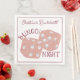 Estas servilletas de fiesta personalizadas tienen un tema glamuroso de noche de juego de Bunco. Una gran imagen de dados con brillo rosa se coloca en el centro. Es perfecto para su próximo torneo de bunco de despedida de soltera. Un nombre de muestra se imprime en la parte superior que puede personalizar para incluir su propio nombre o texto personalizado.