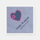 servilletas de papel de boda de tema occidental personalizado hechas con una apariencia azul denim con gráficos de un corazón denim azul oscuro delineado en rosa. Personalice el texto azul oscuro, con los nombres de la novia y del novio y la fecha de boda.