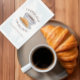 Desayuno nupcial de café y croissants de temporada con fondo azul claro y blanco desgastado