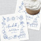 Servilletas personalizadas para despedida de soltera azules y extravagantes, dibujadas a mano. Estas divertidas y juguetonas servilletas para despedida de soltera presentan ilustraciones de garabatos extravagantes alrededor del diseño, todo en un vibrante tema azul. Elementos como una torre de champán, pastel de boda, bola de discoteca, corazones, campanas de boda, anillos, cámaras y más crean un ambiente caprichoso y festivo.