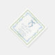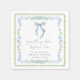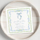 Servilletas elegantes para la despedida de soltera con marcos de acuarela florales azules y verdes con volutas de estilo gran milenario vintage, un delicado lazo coquette azul de acuarela, "algo azul antes de hacerlo" presentado en una elegante caligrafía azul, y el nombre de la novia y la fecha de la despedida en tipografía serif clásica.