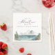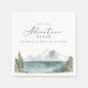 The Clover Collection presenta una pintura de acuarela de un lago de montaña con árboles de pino verdes rústicos y una fuente elegante de guión. Tan perfecto para su tema de montaña o aventura de despedida de soltera.