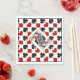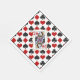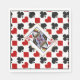 These are cute gift cocktail napkins for a variety of occasions, but especially card parties. They feature the familiar red, black, and white pattern of diamonds, hearts, spades and clubs commonly found in a deck of playing cards. The center of each napkin has a gold frame around the winking Queen of Hearts.
