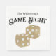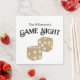 Estas servilletas fiestas personalizados tienen un tema de la noche del juego. Una imagen de jugar a los dados se imprime en el centro en un diseño de purpurina dorado. La frase "Noche del juego" se imprime encima de los dados con un nombre de familia de ejemplo. Puede personalizar las servilletas para incluir su propio nombre o texto personalizado.