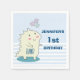 Toallas de fiesta de cumpleaños con un lindo dinosaurio sonriente, mejillas rosadas y RAWR escritas en su vientre. 3 coloridas estrellas felices sobre su cabeza. Se coloca sobre un patrón azul claro y blanco de puntos y rayas de polka.