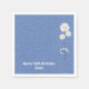 Un ramo blanco de margarita atado con una proa sobre un patrón de puntito y fondo azul. El nombre y el año de cumpleaños son modificables.