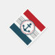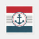 Diseño náutico con decoración de ancla en forma redonda sobre fondo rayado azul, rojo, gris y blanco