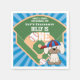 Este lindo diseño de servilleta de papel de primer cumpleaños presenta a un adorable cachorro que usa un sombrero de béisbol y está listo para jugar a la pelota. El fondo es un campo de béisbol con un diseño de starburst azul.