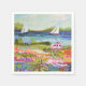 Dos veleros y la cabaña I de Karen Fields. Luminosa y divertida escena con flores, árboles, una cabaña y veleros en el agua.