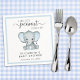 Cuestas servilletas para la ducha de un bebé con "A Sweet Little Peanut Is On His Way" en tipografía gris suave y un guión elegante con toques, y una acuarela azul pastel de un elefante bebé. Personalice el nombre y la fecha de ducha de la futura madre en una simple tipografía gris.