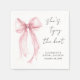 Servilletas Chic para su ducha de novia con una elegante acuarela de un lazo coqueto rosa claro, "Ella está atando el nudo" en una escritura de caligrafía moderna, y el nombre de la novia y la fecha de la ducha en letra simple.