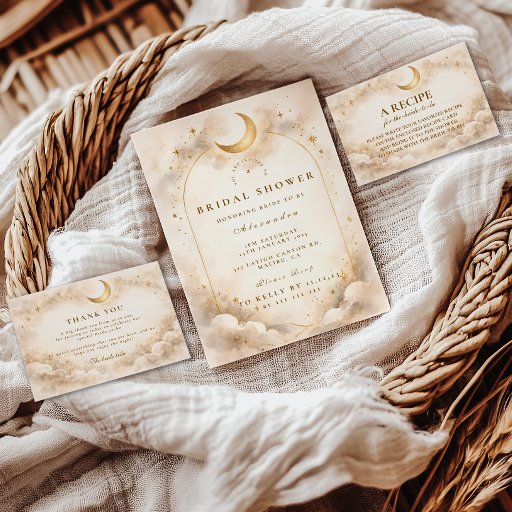 Un diseño celestial soñador que presenta una luna creciente dorada y brillante dentro de un elegante marco arqueado. Nubes suaves y luminosas, destellos delicados de polvo de estrellas y tonos cálidos a champán crean una atmósfera romántica y etérea. El sutil fondo de mármol y los detalles dorados refinados añaden profundidad y sofisticación, manteniendo un brillo suave y aéreo. Perfecto para una novia moderna que ama la magia celestial con una estética elevada y atemporal.